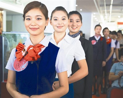 二○一四年「中國十一大光棍職業」榜單已在網上熱傳,作家、歌手、主持人、律師、空姐等「體面」的職業紛紛上榜。圖為年輕女孩熱烈參與空姐選拔賽。圖/中新社