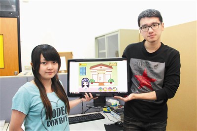 元智大學資傳所學生李書宇(左)、陸翰德(右),設計一款英語學習遊戲「我的寵物店」,讓小朋友從玩遊戲中學英文。