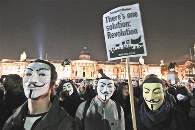五日是「煙火節」,英國倫敦示威者戴「V怪客」面具聚集在特拉法加廣場,參加「百萬面具」遊行,抗議當局厲行緊縮政策、侵犯人權及進行大規模監控。
