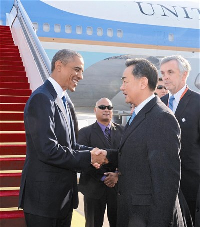 美國總統歐巴馬(左)十日抵達北京,出席亞太經合組織領導人非正式會議並對中國進行國是訪問,中國外交部長王毅到機場迎接。圖/新華社