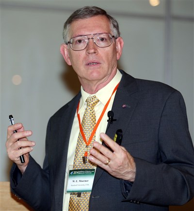 【本報台北訊】今年諾貝爾化學獎得主之一威廉‧莫納爾(William E.Moerner ),今天在中研院原子與分子科學研究所講演「單分子的雙重功能:三維奈米顯微鏡之光源與溶液中多元運動之探針」,他以自身經驗勉勵想從事科學的年輕人,不斷的從失敗中吸取經驗並保持好奇心。