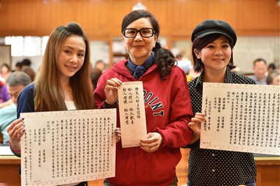 王彩樺(右)帶領「彩樺粉絲團」團員,三度南下佛光山抄經堂體驗抄經修持,藝人李如麟(中)、吳淑敏(左)共襄盛舉。圖/王建傑提供