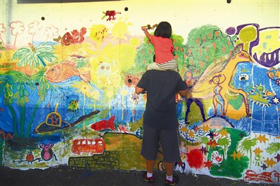 不舞‧阿古亞那帶領不同年級的學生,在校門口擊球牆彩繪。圖/平等國小提供