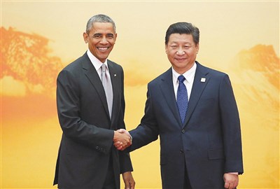 美國總統歐巴馬(左)和大陸國家主席習近平十一日在北京雁棲湖國際會議中心舉行的亞太經合會上握手。圖/路透