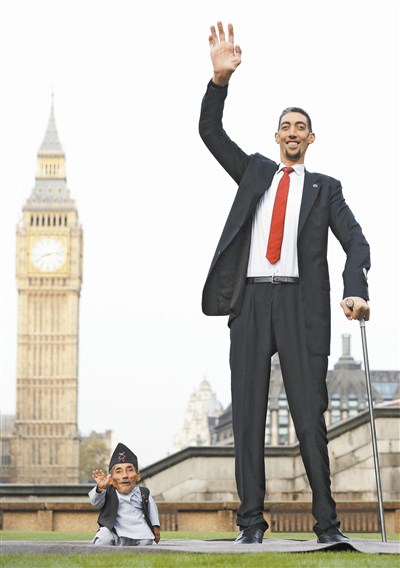 為慶祝金氏世界紀錄六十歲,世界上最高的男人、兩百五十一公分的蘇丹‧克森(Sultan Kosen)與世界上最矮的男人、身高五十四點六公分的錢德拉‧巴哈杜爾(Chandra Bahadur Dangi)昨日一起在英國倫敦亮相。圖/路透