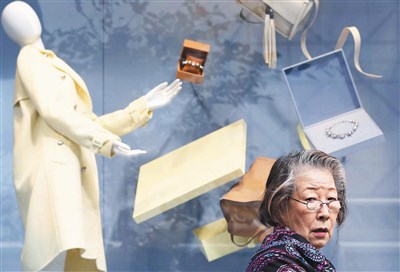 一名婦人十六日行經東京銀座精品店的櫥窗。日本經濟連續兩季負成長,陷入衰退,顯示受到四月消費稅上調的衝擊。圖/路透