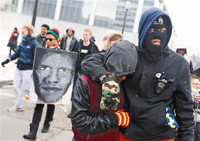 寒冬中,示威者在大陪審團討論地點的街道外遊行(右圖/路透),喊著:「我們要警察被判有罪」。二十四歲的遊行發起人之一夏克爾說,布朗之死激起他的怒火,他不能坐視,雖然附近有居民因為無法做生意而厭惡示威,但他不在意。
