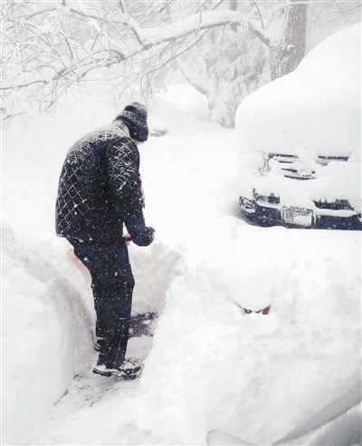 紐約州果園公園鎮一名居民十八日在家門外剷雪。冷氣團襲擊全美,美國五十州的氣溫大多數陡降到零度或零度以下,大雪已迫使紐約州西部宣布緊急狀態。圖/路透