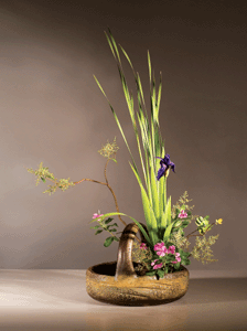 花材:蒲葉、過山香、日日春、燕子花。