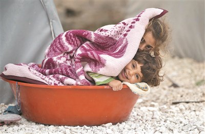 本周在敘利亞科巴尼難民營,兩名庫德族孩童擠在同一條毯子下取暖,食物也成問題。圖/美聯社