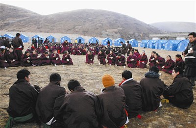 康定地震災民被安置在塔公鄉木雅祖慶校園內,昨天圍成一圈吃饅頭。圖/中新社