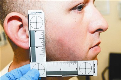這是美國密蘇里州佛格森市警察威爾森八月九日槍殺非裔少年布朗後,檢察官拍下的威爾森臉部照片。圖/路透