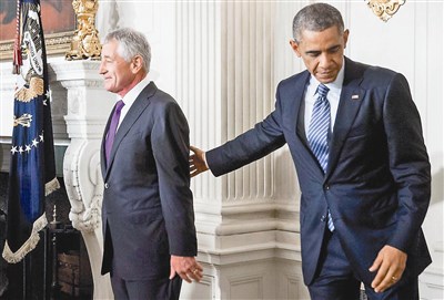 歐巴馬(下圖右/法新社)周一聯同副總統拜登及海格(左)共同出席白宮記者會。講話中,歐巴馬肯定海格任內推動美軍從阿富汗撤軍、打擊IS和應對伊波拉疫情的成績,稱讚海格是模範國防部長。他說,做出這個決定是困難的,但是時候該讓海格離開了。上任不到兩年的海格則感謝歐巴馬的「友誼」,表示相信他讓軍隊和國家變得更穩定。