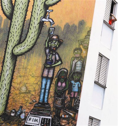 聖保羅地區的小城市每天限水成了家常便飯。當地一幅牆上塗鴉內容是人類拿水杯、提水桶,排隊向「仙人掌」取水(左圖),反映了居民缺水之苦。圖/路透