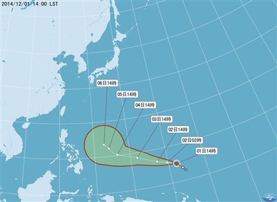 今年首個12月颱成形!位在關島東南方海面上的熱帶性低氣壓,今天下午2時發展成輕度颱風哈格比,是今年第22號颱風,目前中心位置在北緯4.9度,東經152.2度,以每小時25公里速度,向西北西進行,研判應該不會直接影響台灣。圖/中央氣象局提供