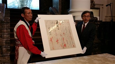 台博館館長陳濟民(右)將該館典藏的「日阿拐軍功牌」交給日阿拐後代「日文來」。圖/周美惠