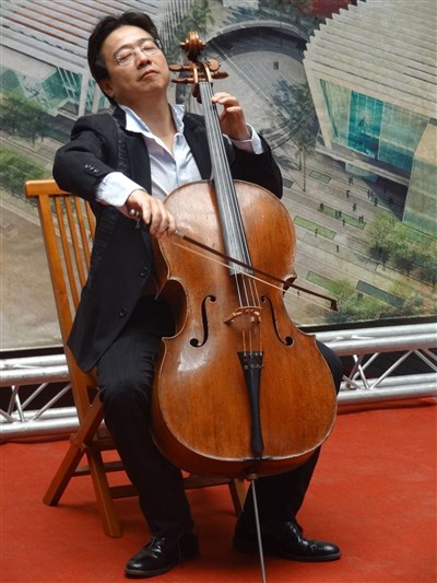 大提琴家張正傑今天特別穿著咖啡紗製成的西裝亮相,並演奏一段帶有咖啡香的音樂,為百元音樂會大力行銷。圖/翁禎霞