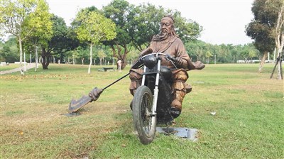 【本報屏東訊】關公騎摩托車?古代關公騎的是赤兔馬,屏東市千禧公園裡最近新添的關公塑像,卻是騎著追風摩托車耍青龍偃月刀,作品十足「穿越fu」;有民眾會心一笑說,以關公「性格」模樣,來到現代一定要「哈雷」一下,「摩托車太小台啦」!