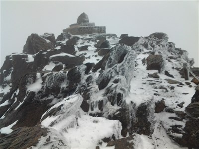 玉山今天清晨再度下雪,主峰積雪達1.5公分。圖/玉山國家公園管理處提供