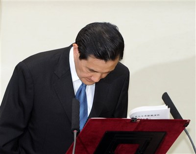 身兼國民黨主席的總統馬英九(圖)今天在國民黨中常會為選舉失敗鞠躬道歉,並宣布辭去黨主席職務以示負責。圖/中央社