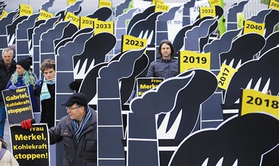 大批手持象徵火力發電廠牌子的德國人,三日聚集在柏林抗議德國政府打算關閉部分燒煤廠,以達到因應氣候變遷所需的減碳目標。
