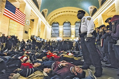 【本報綜合外電報導】繼美國密蘇里州大陪審團上周不起訴射殺手無寸鐵黑人青年的白人員警後,紐約大陪審團三日也決定不起訴勒頸導致黑人小販死亡的白人警察;消息傳出,不滿的紐約民眾立刻抗議,街頭和大中央車站都有不少人就地躺下以示不滿。