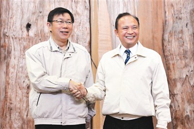 台北市長當選人柯文哲(左)拜會宜蘭縣長林聰賢(右),對北宜直鐵達成共識,不放棄爭取最短路線。圖/中央社