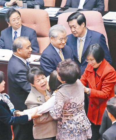 新任行政院長毛治國(中)昨天赴立法院施政報告並接受質詢,但遭台聯立委霸占發言台杯葛,國民黨多名立委把台聯立委架開後,護送毛治國上台報告。圖/林澔一