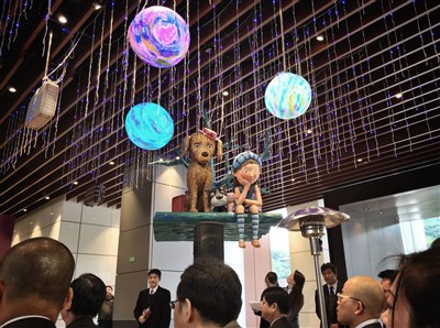 潤泰創新CITYLINK的南港車站門市今天開幕,商場以幾米繪本吹泡泡裝置為主題,吸引民眾目光。圖/中央社