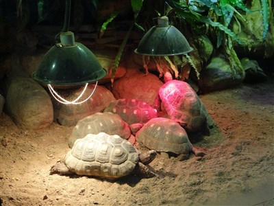 台北市立動物園表示,園裡最怕冷的動物,大都集中在兩棲爬蟲動物館,因此室溫維持在攝氏25度左右,並提供保溫燈。圖為陸龜爭相靠近保溫燈具。圖/中央社