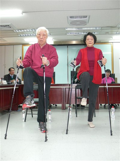 王洪文夫婦參加社區悠活站免費課程,在教練指導下持健走杖練習北歐式健走,或利用沒輪子、非摺疊式的椅子及寶特瓶訓練手、腳肌力,現在的體適能檢測成績比上課前高出許多。
