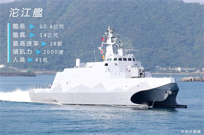 沱江艦長60.4公尺、寬14公尺,最高速率達38節,續航力2000浬,不僅搭載8枚雄二飛彈與8枚雄三飛彈,也有中科院產製的新型自動反制裝置多頻段干擾彈,攻擊火力強大,利用快速與匿蹤的特性,迅速接近目標並發射飛彈攻擊。