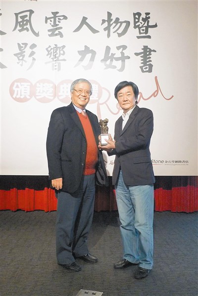 金石堂書店總裁周正剛(左)頒發「二○一四金石堂出版風雲人物」獎給初安民。圖/金石堂提供