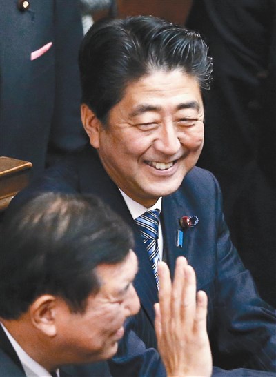 日本首相安倍晉三(右)二十四日在眾議院和重量級議員石破茂相視而笑,後者續任地方創生大臣。圖/路透