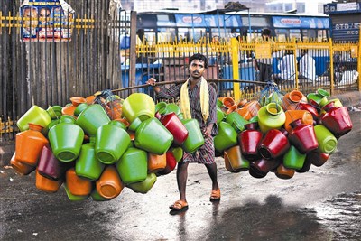 高盛日前預計,二○一六至二○一八年印度GDP增速將超過中國大陸。由於原物料下跌,使得原本受高通膨之苦的印度壓力減輕。圖為印度班加羅爾一名男子扛著一堆空瓶到市場販售。圖/路透
