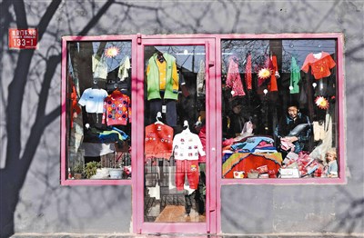 圖為北京一間嬰兒服飾店櫥窗,店內消費者不少。圖/路透