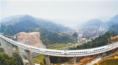 貴廣高鐵、南廣高鐵昨天正式開通營運。圖為由貴陽開往廣州的動車,駛過貴州省從江縣朝利侗寨。圖/新華社