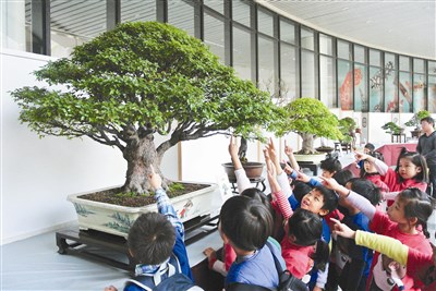 國立自然科學博物館推出「盆景植物特展」,展出五葉松、柏、茶花、壽娘子等六十四件盆景作品,一盆樹齡約二百年全台最資深的「櫸」盆景,收藏家細心照料保持健康狀態。特展展至明年一月四日,現場搭配解說牌,讓觀眾認識盆景知識。圖為觀眾從根盤、樹幹、枝葉認識盆景。圖/喻文玟