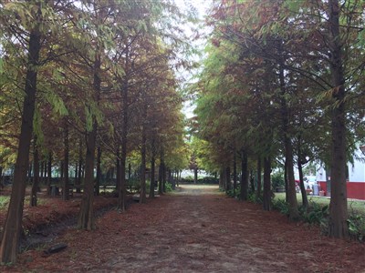 「福龜九佃落羽松林」的落羽松葉已從綠葉轉為橘紅,遊客慕名而來。圖/陳妍霖