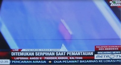 印尼國家搜救總署今天表示,邦加勿里洞省勿里洋島(Belinyu)漁民在搜索區域發現長4公尺、寬1公尺的紅白色碎片,確定是亞航QZ8501班機的緊急滑梯和艙門等殘骸,圖為印尼美都電視台的播放畫面。圖/中央社