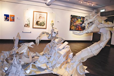 【本報新北訊】淡水國中第二十一屆藝術才能專班,把對未來的期盼、天馬行空的想法,寄託在畢業作品上,班導高琇慧說,學校對學生的創意不設限,但在基本功的要求仍不馬虎,這次展覽幾乎都放手給學生自由發揮,把市圖淡水分館的展覽廳,布置成充滿未來幻想的世界。
