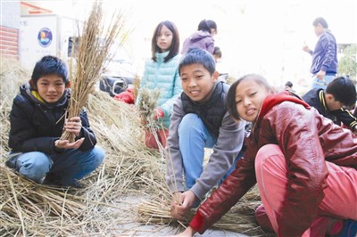 學生莊家澍和同學玩得不亦樂乎,一人踩著竹條、一人負責整理禾桿,興奮地說:「禾桿非常溫暖,還有大地的香氣。」