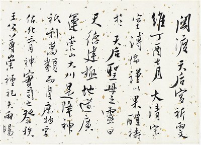 恭王家族特權隨清王朝滅亡一去不復返後,溥儒以一方「舊王孫」印章自嘲。這回展品中有一件他在一九五七年寫的〈關渡宮祈雨文〉,他也以「大清宗室溥儒」自居。史博館研究員蔡耀慶說,那一年夏天苦旱,溥儒備果醴來到關渡宮「為台灣八百萬餘生民祈旦夕之命」,可見他是有心人。