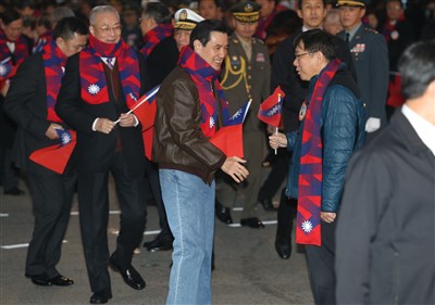 出席元旦總統府前升旗典禮,馬英九總統(中)主動趨前向台北市長柯文哲握手致意,柯文哲則直接舉起手握國旗的右手與馬總統「拳握」,兩人短暫交會。圖/林俊良