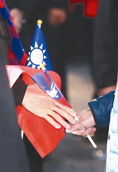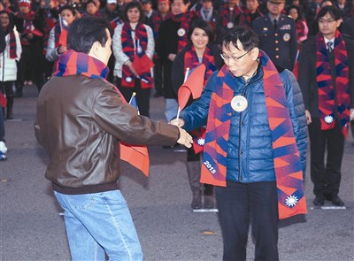 馬英九總統與台北市長柯文哲昨天清晨在元旦升旗典禮首次同台,馬總統主動向首次出席的柯文哲握手致意(上圖/林俊良),柯文哲則直接舉起握著國旗的右手與馬總統「拳握」(左圖/中央社),兩人短暫交會並無互動。
