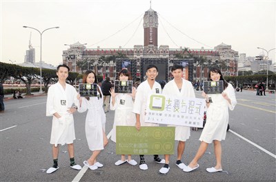 公廣系六位學生昨天穿白色浴袍參加升旗典禮,與一旁穿著厚重外套的民眾形成強烈對比。