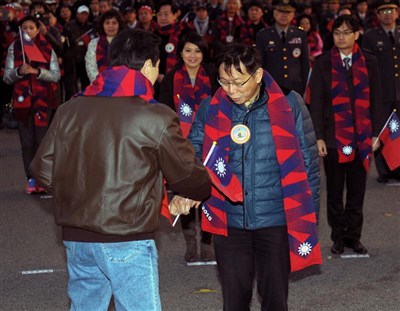 總統馬英九與台北市長柯文哲參加元旦的升旗典禮,彼此短暫握手。圖/中央社