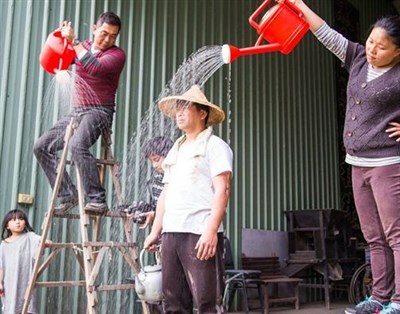 為配合下雨劇情的需要,王瑞雄爬上梯子以澆水器製造下雨假象,農場猶如片場,農民全成了演員。圖/王瑞雄提供
