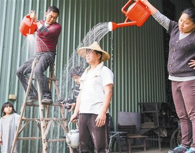 為配合下雨劇情的需要,王瑞雄還爬上梯子以澆水器製造下雨假象,農場猶如片場,農民全成了演員。圖/王瑞雄提供