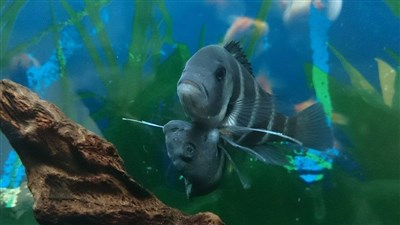 連體魚就在餐廳水族缸中優游,遊客常好奇圍觀、拍照。王致竣說,剛帶回的連體魚,就是一大一小,「哥哥」約4公分,「弟弟」1公分,現在哥哥有20公分、弟弟約6公分。
